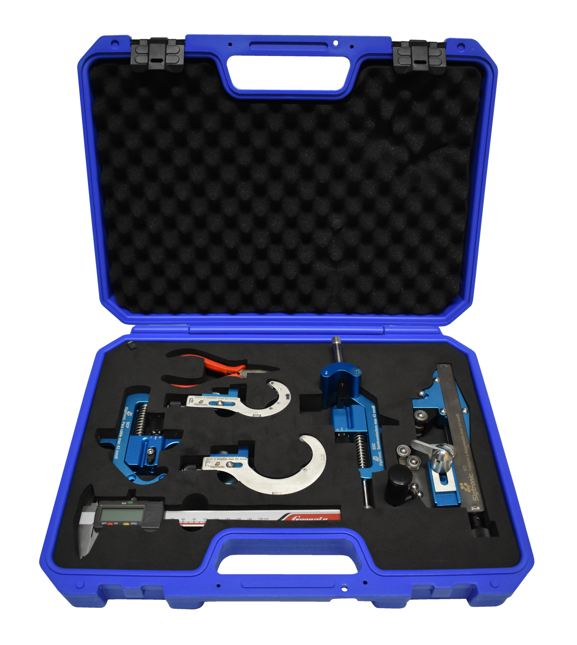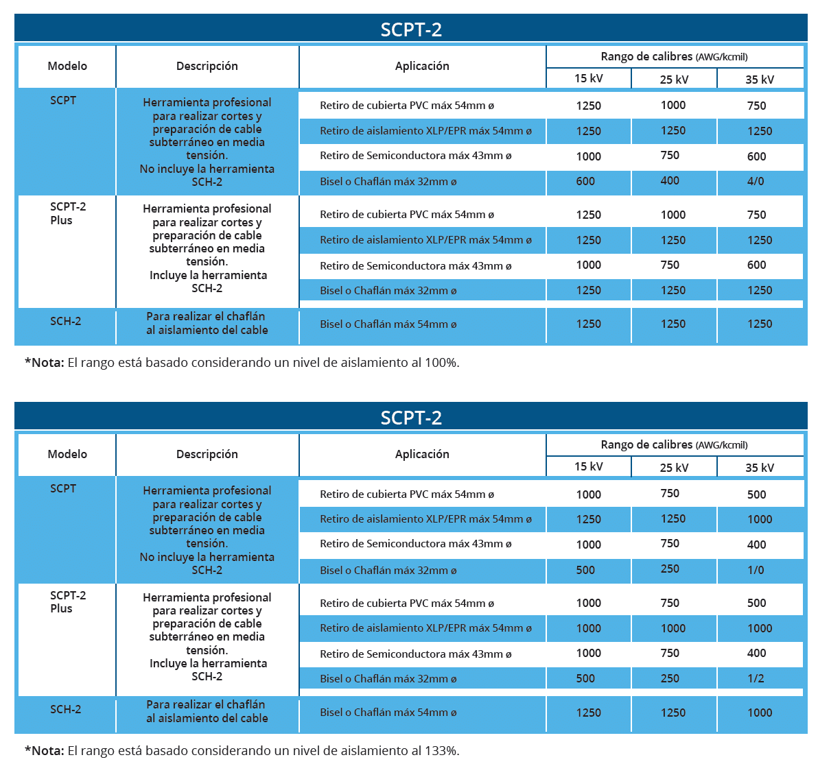 La versión SCPT-2 Plus se distingue por incluir además la herramienta SCH-2, la cual expande notablemente la capacidad del kit, permitiendo realizar el chaflán en cables de mayor calibre, hasta 1250 kcmil (para 15-35 kV con aislamiento al 100 y 133%).